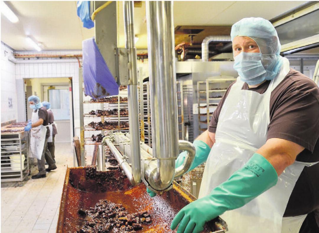 Wie viel Handarbeit in den süssen Köstlichkeiten steckt, das offenbart sich beim Besuch in der Backstube. Doch bevor man da rein darf, gilt es, Schutzkleidung zu montieren, von Kittel und Schuhüberzügen bis zum Haarund Bartnetz. Produktionsleiter Stefan Fust ist Mitarbeiter der ersten Stunde. Unter seiner Leitung produzieren rund zehn Mitarbeitende in zwei Schichten jeden Tag die süssen Köstlichkeiten. Für die besondere Note sorgt der Schrapsüberzug. Dank ihm sieht jedes Magenbrot anders aus. Franziska Bosio spricht in diesem Zusammenhang vom «Grossmutter-Touch», ihren Vater zitierend.