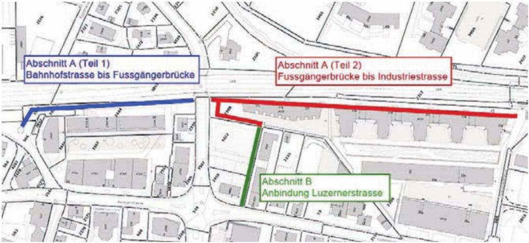 Das eigentliche Projekt Radnetz ist in die drei Abschnitte A, B und C unterteilt. Wobei der Abschnitt A2 vom östlichen Ende der aktuell geplanten Fuss- und Radwegbrücke entlang der geplanten Überbauung «Groli-Areal» zur Luzernerstrasse führe. Die Erschliessung des Wegstücks an die Luzernerstrasse, das Teilstück B, steht im Zusammenhang mit dem ebenfalls ausgesteckten Überbauungsprojekt auf dem «Groli-Areal». Gemeinderat Jörg Weiss sagt: «Mit der Bauherrschaft hat der Gemeinderat vereinbart, dass die Umsetzung des Teilstücks B in der Überbauung realisiert werde.» Da komme es darauf an, wann gebaut wird.