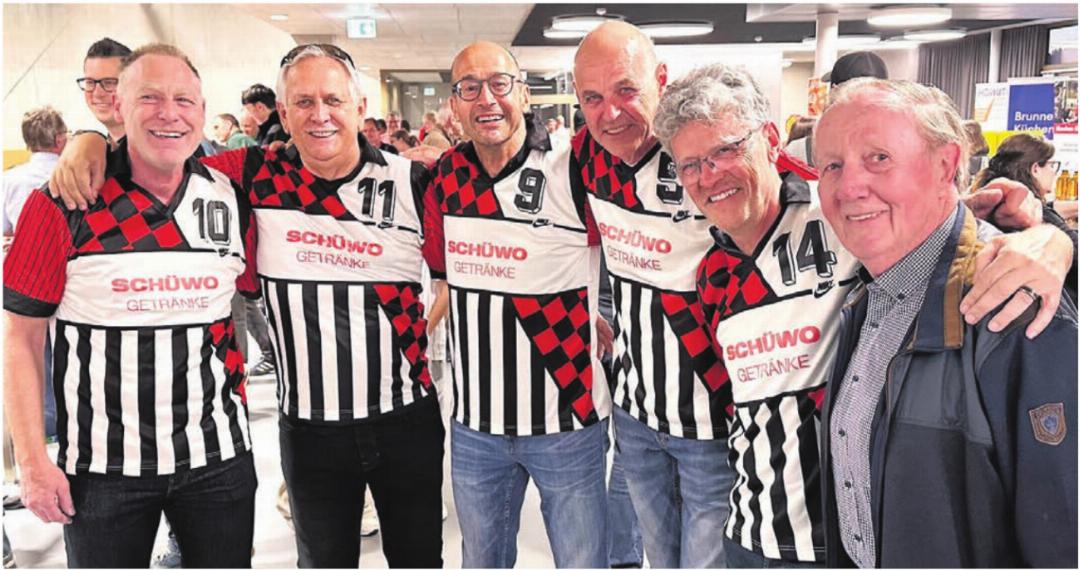 Die legendären Aufstiegshelden von 1989 kommen im damaligen Trikot an die Aufstiegsspiele in der Hofmattenhalle