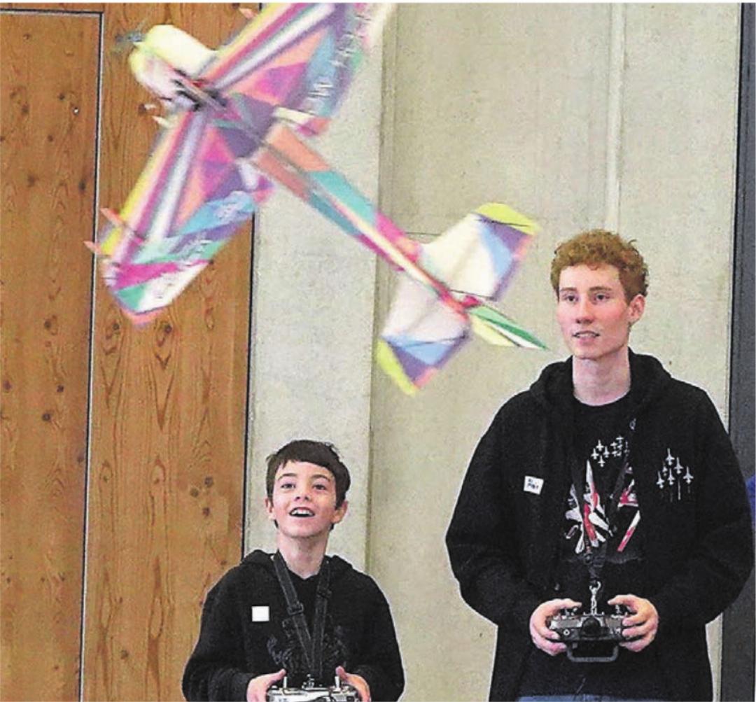 Besonders beliebt waren die Flugsimulatoren, an denen die Jugendlichen unter Anleitung von Nachwuchspilot Levin und Vereinsveteran Walter erste Starts und Landungen üben konnten – ganz ohne Risiko von Bruchlandungen. Anschliessend ging es ans echte Lehrer-Schüler-Fliegen in die Halle: Mit Unterstützung der Fluglehrer Alain, Adrian und Urs durften die jungen Gäste selbst einen Sender übernehmen und ein Modellflugzeug durch die Halle steuern. Die Begeisterung war spürbar, die Konzentration hoch – und die fünf Minuten Akkulaufzeit vergingen wie im Flug.