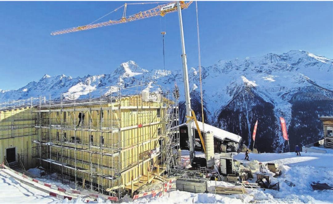 In der Produktionshalle der Schäfer Holzbautechnik in Dottikon wurden ab August die Decken- und Wandelemente hergestellt. Die Badezimmer wurden als Module fixfertig vorproduziert und konnten vor Ort nur noch durch den Sanitär angeschlossen werden. Die ersten Holzelemente wurden bereits im September auf die Lauchernalp transportiert, parallel starteten die Baumeisterarbeiten vor Ort. Neben der zeitlichen Herausforderung gab es auch beim Bau selbst einige Besonderheiten zu beachten. Wind, Schnee, Lawinen, Erdbeben: Das Lötschental hat es in sich. So musste der dreistöckige Bau statisch gesehen so gebaut werden, als hätte er sieben Stöcke.