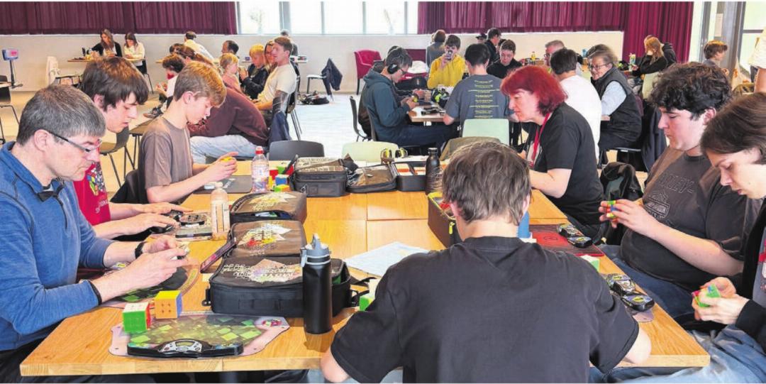 Das fällt schnell auf: Es gibt keinen Unterschied zwischen Alt und Jung. Überall im Raum sitzen Menschen aus der ganzen Schweiz an grossen Tischen und haben etwas gemeinsam: die Leidenschaft für den Zauberwürfel. Zwischen konzentrierten Blicken und geschickten Fingerbewegungen wird geübt, diskutiert und gefachsimpelt. Manche lösen im Sitzen, andere stehen daneben und beobachten. Die Atmosphäre wirkt ruhig und gleichzeitig voller Spannung.