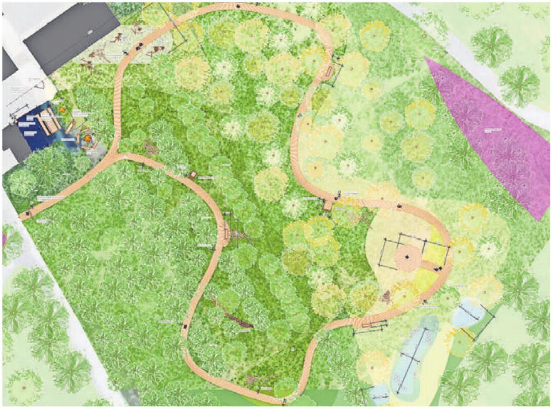 Herzstück des geplanten Lernorts Wald und Natur ist ein 300 Meter langer Holzsteg, der schlaufenförmig durch den ehemaligen Pflanzgarten verläuft.