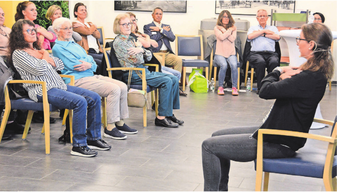 «Bewegung ist das beste Training», macht der Hausarzt deutlich. Und auch die Vertreterin der Pro Senectute betont den positiven Effekt eines regelmässigen Trainings. Sie präsentiert einfache Kraft, Bewegungs- und Gleichgewichtsübungen, die jeder und jede zu Hause durchführen kann. Crameri betont die vielen positiven Effekte, welche dies mit sich bringt. Nicht nur kann die Kraft länger erhalten werden, auch das psychische Wohlbefinden wird gesteigert. Zudem lassen sich gesundheitliche Gefahren wie Hirnschlag oder Bluthochdruck reduzieren. «Versuchen Sie, die Übungen in den Alltag zu integrieren. Nehmen Sie die Treppe statt den Lift, Gehen Sie zu Fuss ins Dorf statt mit dem Auto. Laufen Sie auf Zehenspitzen durch den Gang. Noch mehr Spass macht das Training aber in der Gruppe», so ihr Ratschlag an das Publikum. Gerade die Pro Senectute hat ganz viele Sportangebote im Programm.